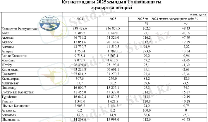 3-ші суретте, ҚҚШО талдауынан алынған мәлімет, яғни 2024 жыл мен 2025 жылдар аралығындағы жалпы құс саны келтірілген. 2024 жылы құс саны 45158, 7 мың бас болса, 2025 жылы ақпан айындағы санақ бойынша 45990, 9 мың басты құрап, алдыңғы жылмен салыстырғанда өскенін көруге болады.