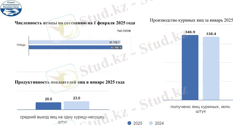 Сонымен қатар, тауықтардың өнімділігінің көрсеткіші де келтірілген, бір тауық басына алғандағы орташа жұмыртқаның шығуы 2024 жылы 23 дана, ал 2025 жылы 20 дананы құрайтындығын көріп тұрмыз.