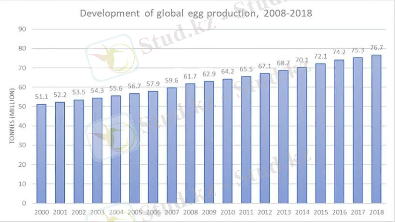 Бұл ақпарат көздерінде дүниежүзі бойынша жұмыртқаның өндірісінің артқаныдығын көруге болады. Мысалға 2000 жылдары 51, 1 млн дананы құраса, ал 2010 жылы 64, 2 млн дана болған, ал 2018 жылы бұл көрсеткіш 76, 7 млн дананы құрағандығын анықтаған, нәтижесі 2-ші суретте келтірілген.