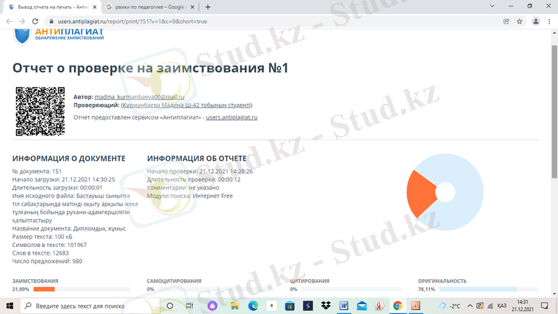 Біліктілігі: 0105013-«Ағылшынша білімі бар бастауыш білім беру мұғалімі»