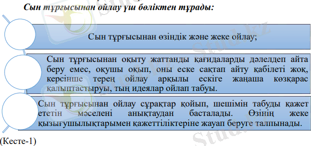 Бастауыш сыныптағы қазақ тілі сабақтарында оқу мен жазу арқылы сын тұрғысынан ойлау технологиясын қолдана отырып тұлға қалыптастыру тәжірибесін сабақтарда қолдану. Сын тұрғысынан ойлауда оқушы болжайды, зерттеп, қорытып, өз ойын жеткізеді, негізін ашады, сұрыптайды, талқылайды, сын көзбен қарайды, пікірін дәлелдейді, пікір алмасады, ортақ пікірге келеді, мақсатқа жетеді, өзін-өзі басқарады, топпен жұмыс істеуге үйренеді, ойлауды, қызығушылықты арттырады.