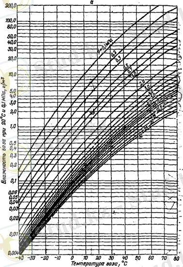 Қалыпты жағдайда көмірсутек газдарының ылғалдылығы ауа ылғалдылығынан жоғары болады, алайда температура көтерілген сайын бұл айырмашылық азаяды. Салыстырмалы тығыздығы 0, 60-қа тең, құрамында азот және қаныққан су булары жоқ, температурасы 40-180°С интервалындағы әр түрлі қысым жағдайында табиғи газдардың тепе-тең ылғалдылығын анықтау үшін Бюкачек теңдеуі бойынша құрылған графиктің (1. 1-сурет) көмегіне жүгінген жөн:
