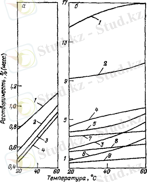 Сурет. 1. 6. Диэтиленгликольде парафинді көмірсутектердің еріткіштігі мөлшері 97 % (масс. ) (а), нафтенді және ароматты көмірсутектердің (б) әртүрлі температурада: К 4, 7 - толуол, мөлшері ДЭГ 97, 90 и 85 % (масс. ) ; 2, 5, 8 - л- ксилол, мөлшері ДЭГ 97, 90 және 85 % (масс. ) ; 5, 9 - циклогексан, мөлшері ДЭГ 97, 90 и 85 % (масс. )