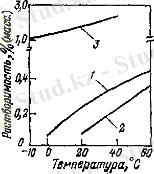Сурет 1. 7. Әртүрлі температурада гликольде газоконденсаттың еріткіштігі : 1, 2 - 97 и 90% (масс. ) диэтиленгликолде сәйкес; 3 - 99, 5% (масс. ) пропиленглнколь.