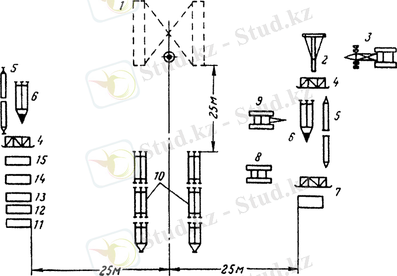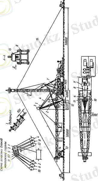 3-сурет . Мұнара элементтерінің, көтергіш құралдардың және тракторлардың құрылыс алаңында орналастырылу схемасы: 1 - мұнараның астындағы негіз; 2 - МПВ жебесі; 3 - КП-25 краны; 4 - тағаналар; 5 - сүйеу; 6 - мұнараның төменгі секциясы; 7 - қабылдағыш көпірдің бөлшектері; 8 - тартқыш трактор; 9 - КСГ краны; 10 - мұнараның секциясы; 11 - мұнараның кронблок астындағы бөлігінің бөлшектері; 12 - кронблок астындағы рама; 13 - кронблок; 14 - кронблок астындағы алаң; 15 - полатьтардың бөлшектері .