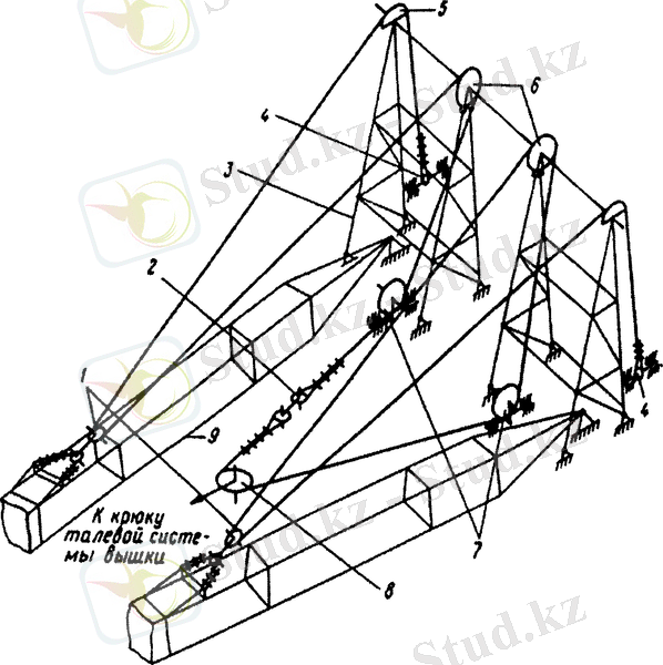 5-сурет. Қозғалмайтын жебесі бар мұнараны көтеру механизмінің жабдықталу схемасы: 1 - төменгі аспаның блогы; 2 - құлып; 3, 6- тағаналар; 4 - шығыршық; 5 - бастиек; 7 - төменгі блок; 8 - аспаның блогы, 9 - мұнараның негізі