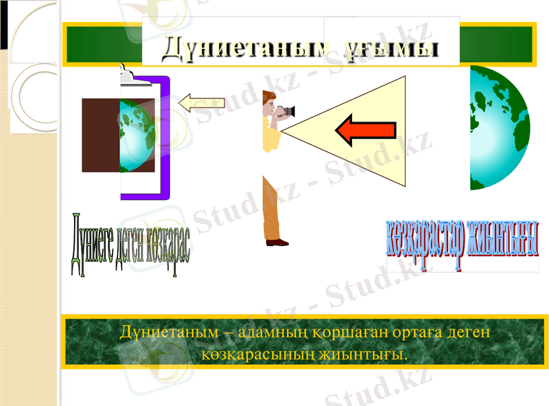 - Дүниетаным- әлемді түсіну, қабылдау, қоршаған ортадағы шынайылыққа жалпылама көзқарастар жүйесі.