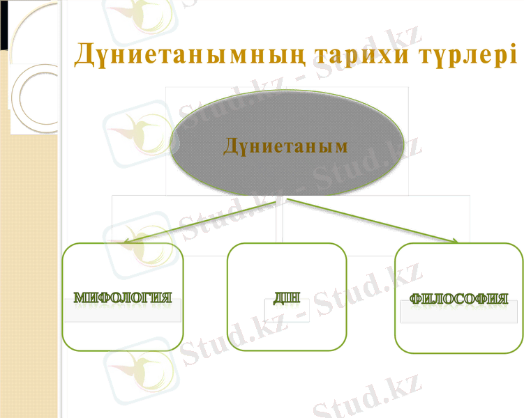 - Философия- дүниетанымның ғылыми-теориялық түрі. Философиялық дүниетанымның діни және мифологиялық дүниетанымдардан айырмашылығы: