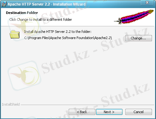 Бұл терезеде Апачтың файлдарын тастайтын жолын көрсетеді. Ол өздігінен файлдарын мына жерге тастайды: C:\Program Files\Apache Software Foundation\ Apache2. 2\ . (windows 7 немесе vista қолданушыларына С:\Users\Public бумасына орнатуға кеңес беріледі)