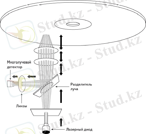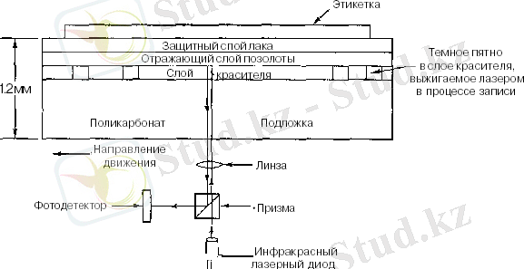 2-сурет. CD-R-ның дискіге және лазердiң көлденең қимасы (масштаб сақталмайды) .