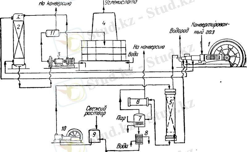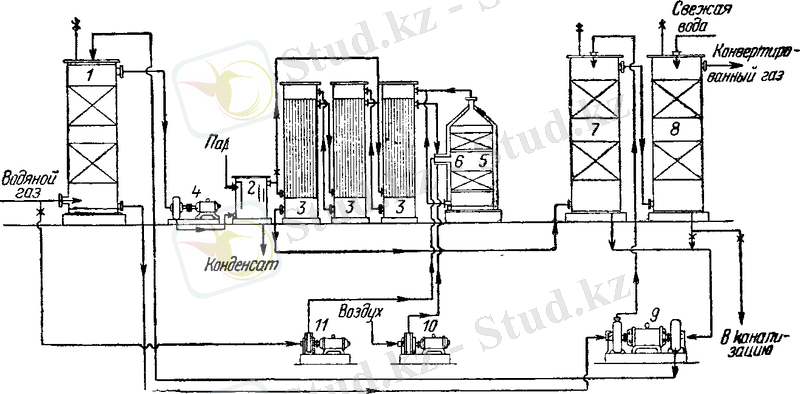 температураға дейін қыздырылады. Кейін су насоспен 9 қайтадан сатурационды мұнараларға беріледі. Газ кейін тоңазытқыштан 8 суық су көмегімен қалыпты температураға дейін салқындатылады. Бұл жерден конвертирленген газгольдерге түседі және кейін көмірқышқыл мен көміртек тотығы қалдықтарынан тазартуға жіберіледі.