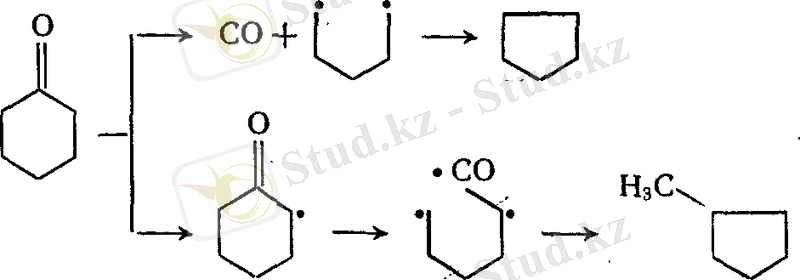 Олардың айналуы деструктивті гидрогенизация жағдайында (485°С, ≈ 30мПа, жартылай кокстегі Fe катализаторы) радикалды механизм бойынша өтеді. Мысалы, циклогексанон мен циклогексанның өнімдерінің салыстырмалы шығымы, циклогексан 17, 1% және 86%, метилциклопентан 17, 6% және 30%, циклопентан 8, 4 және 0%. Олай болса, процесс схема бойынша өтіп жатыр деп ойлағанымыз қате пікір.