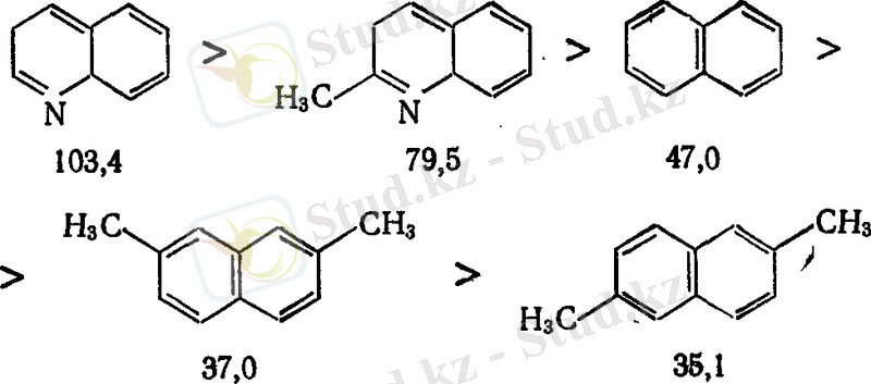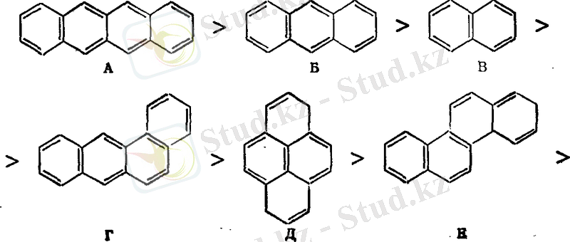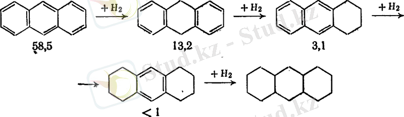 Айта кету керек, полициклды көмірсутектерде мұндай заңдылық гидрлеудің бастапқы жылдамдығының деструктивті гидрогенизацияның нақты жағдайында қысқа байланыстың саны мен қысқалығына тәуелді бола отырып, термодинамикалық және адсорбциялық шектелулерге бұрмаланады.