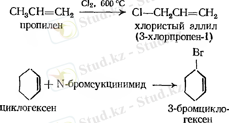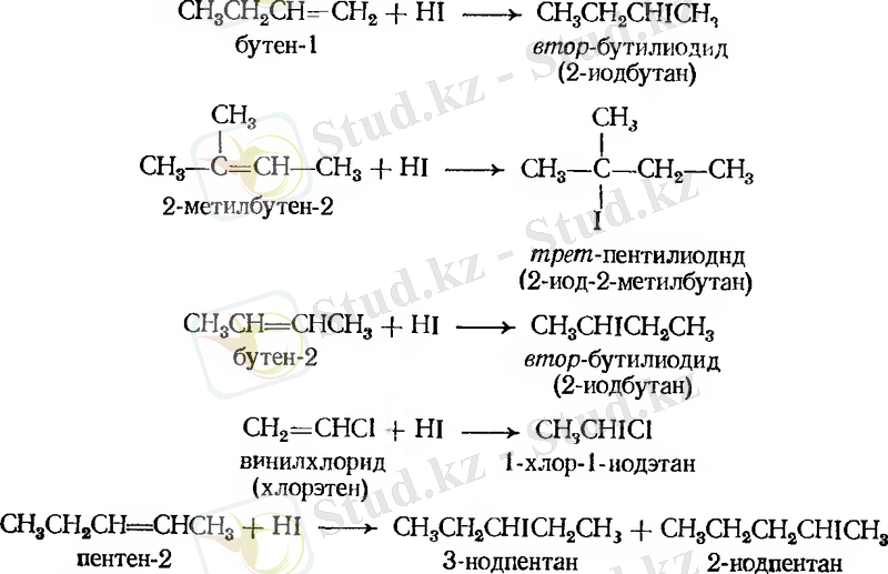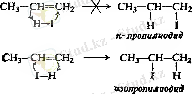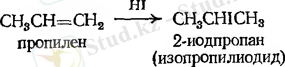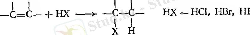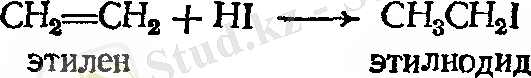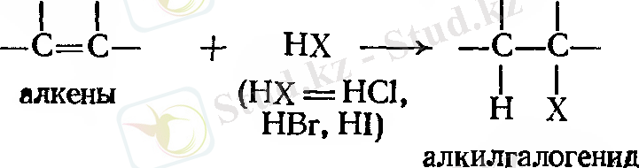 Осылайша этилен этилгалогенидке айналады, сутек көміртек атомының қос байланысына барып қосылса, ал галоген басқасына қосылады.