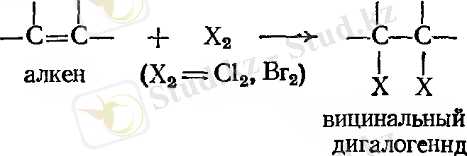 Құрамында екі галоген атомы көрші көміртек атомымен алкендер хлор және броммен оңай реакцияға түсіп, қаныққан қосылыстар түзеді. Йод негізі реакцияға қатыспайды.