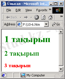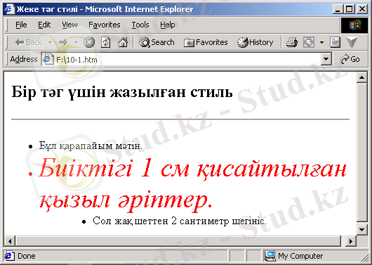 Стиль style атрибутымен берілген. Мұнда браузерге абзацты көлемі 1. 5 санти-метр болатын жасыл әріптермен жазуға нұс-қау берілген.