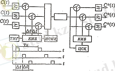 Үш каналды уақыт арқылы біріктіру жүйесінің құрылымдық сұлбасы көрсетілген. Жүйенің беру жағында жеке үздіксіз сигналдар ТЖС арқылы электрондық кілтте үздіксіз сигнал дискреттеледі.