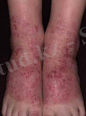 Клиникалық көрінісінде эритематозды - лихеноидты бөртпелер аяқ-қолдың ішкі бетінде, мойын аймағында лихенизация дамуымен (тері қалыңдаған, сипап-сезгенде қатқыл, тері суреті айқын) . Таралу және айқын көрініс беру дәрежесі әр түрлі: тері жабындысының мөлшерлі жерінің зақымдануынан көлемді зақымдануға дейін, көп жағдайда зақым ошағы бет аймағында орналасқан.