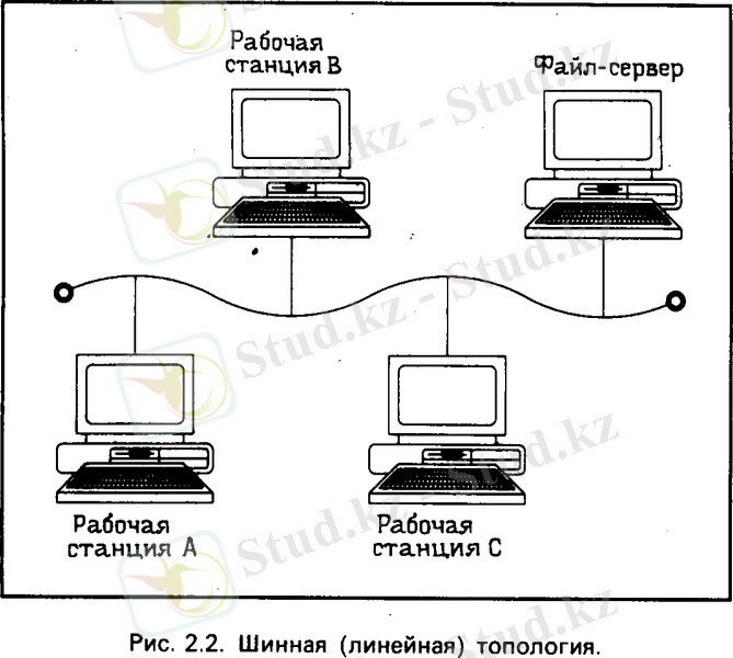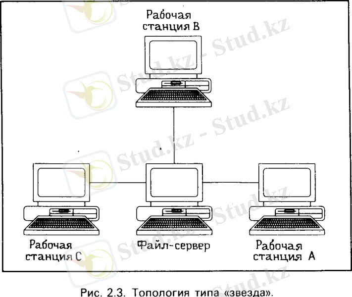 1 суретінде жұлдызша арқылы байланысқан компьютер көрсетілген. Бұл жағдайда әр компьютер арнайы торбтық адаптер арқылы жеке кабель арқылы біріктіруші құрылғыға жалғанады.