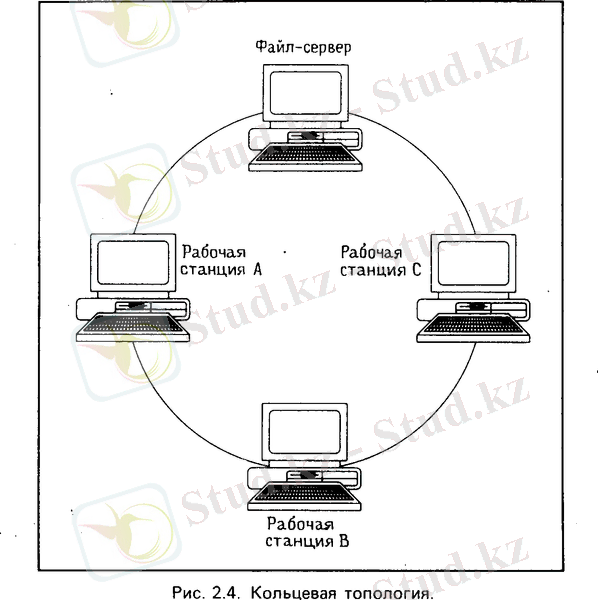 Сонымен қатар “сақина” топологиясы да қолданады (3-сурет) . Бұл жағдайда мәліметтер бір компьютерден екіншісіне эстафетадағы секілді беріледі. Егер компьютер басқа компьютерге арналған мәліметтерді алса, онда ол оны әрі қарай сақина бойымен жібереді. Егер мәліметтер оны алған компьтерге арналған болса, онда олар әрі қарай жіберілмейді.