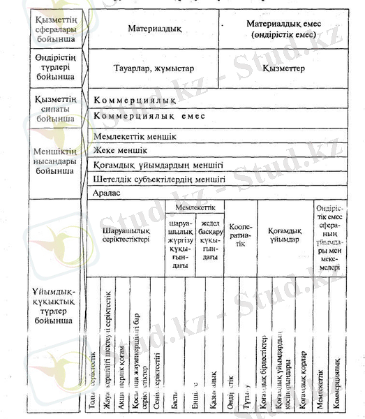 Межелеудің ең жалпы белгісі кәсіпорындар мен ұйымдарды қызмет сфераларының біріне - материалдық немесе материалдық емес (өндірістік емес) сфераға жатқызу болып табылады. Қызметтің материалдық сферасының кәсіпорындары бүкіл қоғамның тіршілік әрекетінің негізі болып табылатын материалдық өнімдер мен игіліктерді жасайды. Бұл сферада жасалған өнімнің бір бөлігі оның салалары ішінде (өңдірістік тұтынудың өнімдері) тұтынылады, басқа бөлігі түпкілікті тұтынуға, соның ішінде өндірістік емес сфераға да бағытталады. Ө ндірістік емес сфера қызметінің нәтижелері қызметтердің нысанын қабылдайды, қызметтерді жасаудың процесі, әдеттегідей, оларды тұтыну процесімен тоқайласады, яғни олар қордалауға, сақтауға жатпайды.
