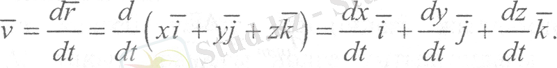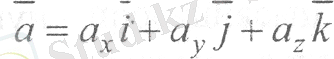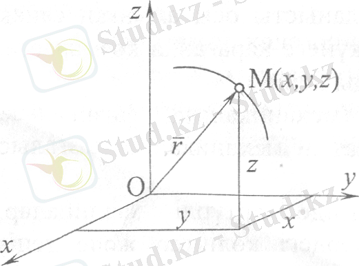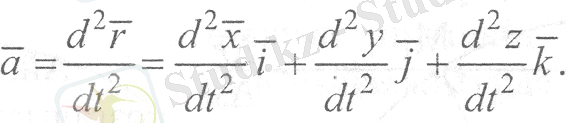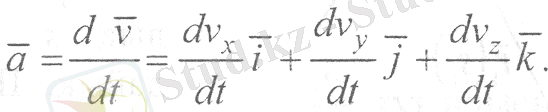 Нүкте қозғалысының теңдеуі координаталық тәсілмен берілген кездегі нүкте жылдамдығы мен үдеуін анықтау. Кеңістікте емін еркін қозғалып бара жатқан нүктенің қозғалысын Oxyz координаталар жүйесіне (5-сурет) қатысты қарастырайық. Жылдамдық векторы нүктенің радиус-векторынан уақыт бойынша алынған бірінші туындыға тең екенін ескере отырып (5) теңдігінің екі жағынан да уақыт бойынша туынды аламыз.