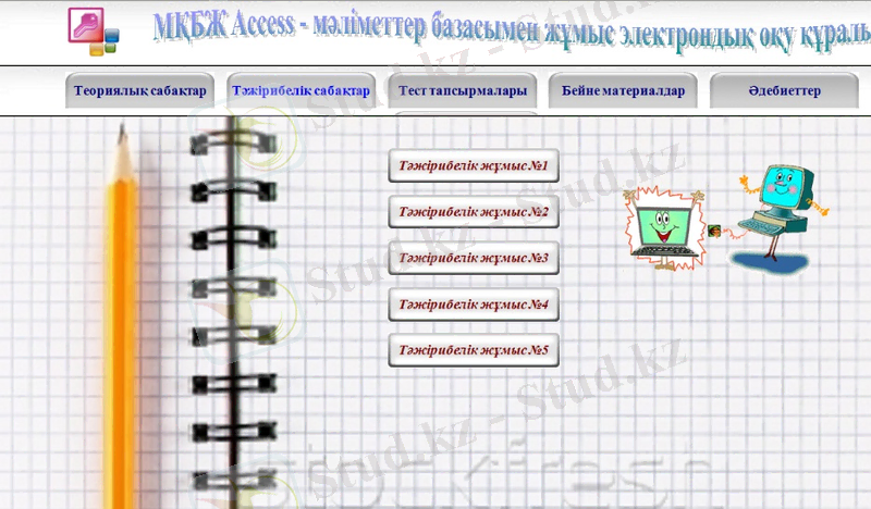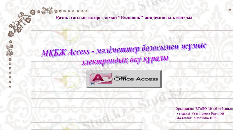 Менің дипломдық жобамның тақырыбы «МҚБЖ Access мәліметтер базасымен жұмыс» тақырыбында электронды оқулық.