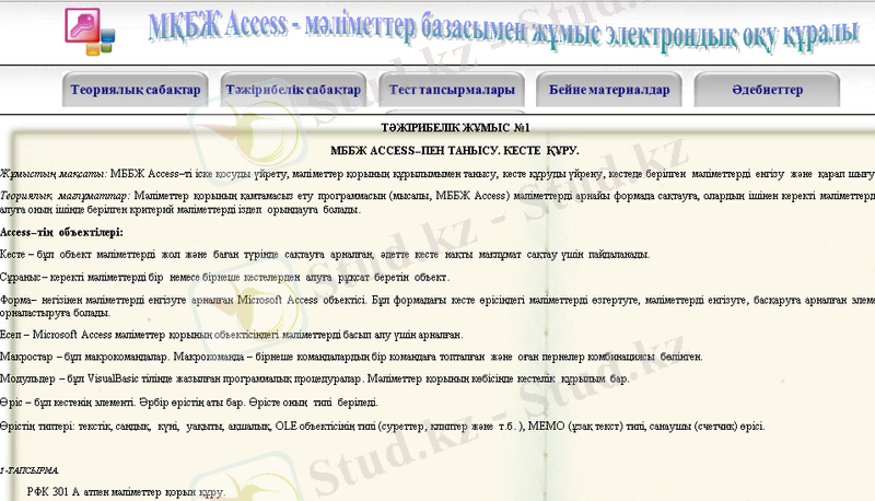 Практикалық бөлімінде «МҚБЖ Access мәліметтер базасымен жұмыс» тақырыбында зертханалық жұмыстар берілген.