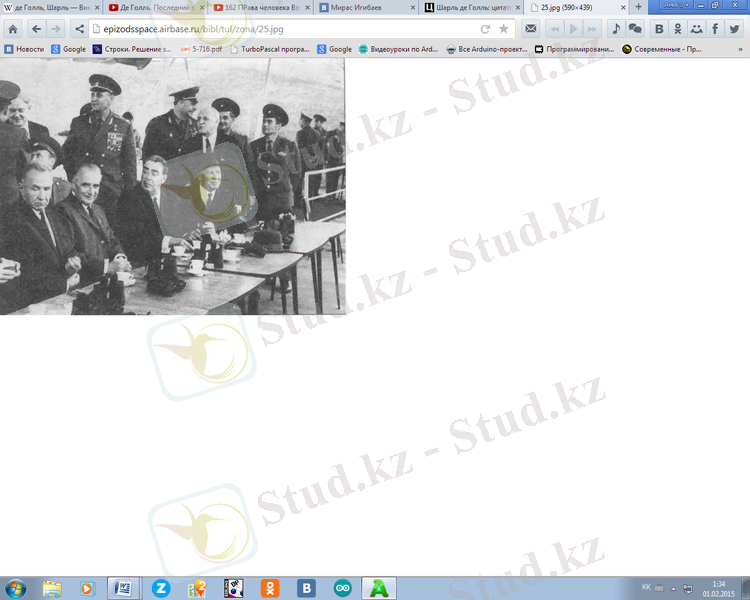 1960 жыл Шарль де Голль бірқатар француз елішілігімен Байқоңыр сынақ алаңында және Брежневпен саяси достастық, бірлестік, экономикалық дамуды талқылауда.