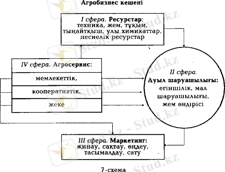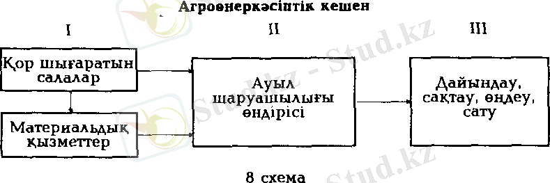 Агроөнеркәсіптік кешен құрылымы агробизнес кешені құрамымен өте ұқсас және ол үш негізгі сфераның басын құрайды. (8-схеманы қараңыз) .