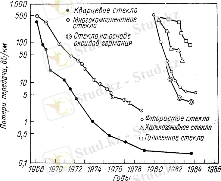 1-суретте әртүрлі оптикалық талшықтардың жылдар аралығында берiлудiң ең төменгi жоғалтуларын төмендету кестесі көрсетiлген.