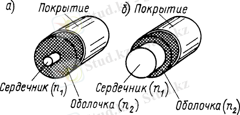 2 сурет Бір модалы (а) және көп модалы (б) оптикалық талшықтар