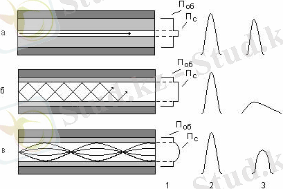 Сурет-6. Жарық өткізгіштегі толқындардың таралуы : а -бірмодалы, б - көпмодалы сатылы профильмен, в - көп модалы градиент профилімен[6]