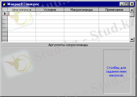 екі бағанды құрайды. Бағандар Макрокоманда және Примечание деп аталады. Имя макроса және Условие бағандарын қосу үшін менюден Вид таңдап алу керек. Менюдегі Макрокомандадан макросты жіберген кезде орындалатын әрекеттерді таңдап алу керек. Применить Фильтр, Сигнал, Отменить событие, НаСтраницу, Восстановить және Показать Все Записи- міне бұлар тізімдегі 50 әрекеттің ішіндегі әрекеттер.