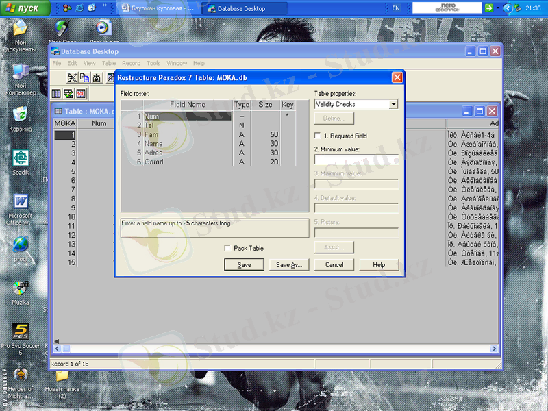 Құрылып жатқан кестенің әрбір өрісіне бір жазба сәйкес келеді. Field Name бағанына өріс атын, Type - символ, өрісте сақталынатын мәліметтердің типін анықтайды. Size бағанына - сан қойылады, өрістің ұзындығын анықтайды, Key-«*» символы, егер бұл өріс бойынша біріншілік кілт қою керек болса.