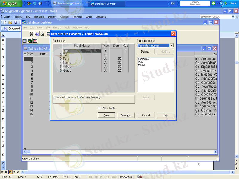 Жаңа индекс құру үшін Define - анықтау батырмасын басу керек. Бұл батырманы басқанда көру диалогтық терезесі ашылады. Оның сол жақ терезесінде Fields қатынау өрістерінің тізімі көрсетілген, ал оң жақ терезесінде Indexed Fields екінші индекс болатын өрістер көрсетіледі.