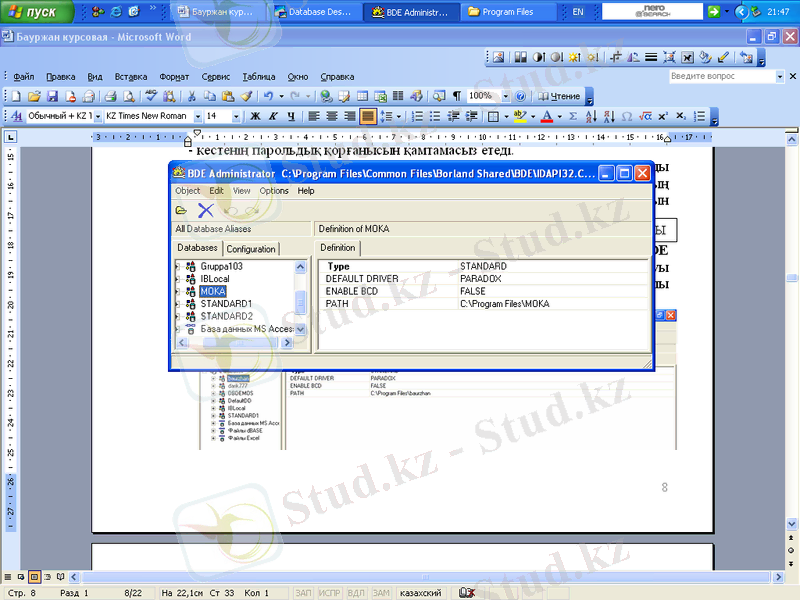 Ал енді мәліметтер базасымен жұмыс жасамас бұрын, біз оның каталогын құрып алайық. Ол каталог бізде D:\POS. Деректер базасын құру DataBase Desktop (DBD) утилит көмегімен іске асырылады. DBD утилит көмегімен кестені құруға және оның құрылымын өзгертуге, оның біріншілік кілттерін және индекстерін, жазбалар құру және өзгертулер жасауға болады.
