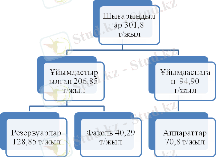 Мұнай өндіруші Қотыртас кенорнының атмосфераға шығарылатын зиянды шығарындылар көздерін есепке алу мәліметтерінің талдауы, ортақ жалпы шығарындыларының негізі бқлігін көмірсутектер және көмір оксиді құрайды. Шығарындылардың көбі резервуарлар мен факельдерден келетініне төмендегі диаграмма айғақ бола алады.