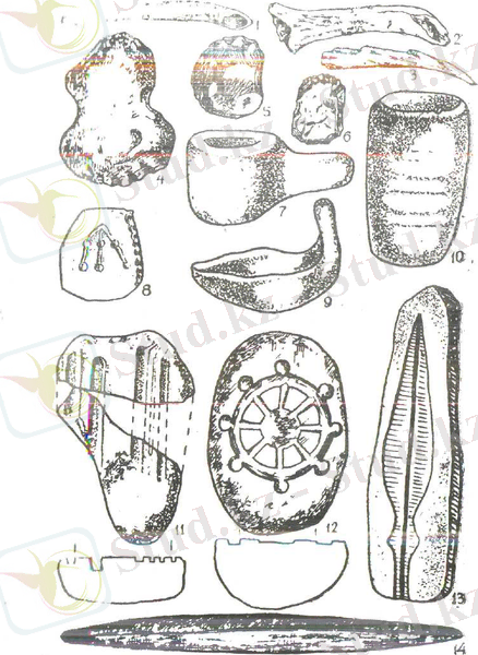 т. т. ), дегенмен, мұнда да қола балға шоттар, балғалар қолданыла бастады. Енді тас, негізінен, кейінгі тарихи мамандарда да тастан жасалған астық түйгіш, тоқпақша, келі, келісап, үккіш, жүкше, ұршықбас, сыр түйгіш секілді құралдар молі бұйымдарды жасауға пайдаланылды.