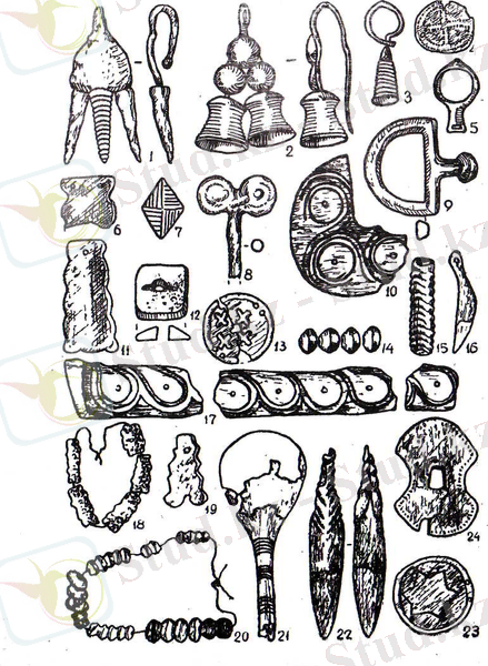 Қола дәуіріндегі Қазақстан территориясында тұрған тайпалардың зергерлік өнерінің тамаша заттары - алтынмен апталған қола әшекейлер, самайға тағылатын әр түрлі сырғалар, күрекше тәрізді түйреуіштер, ромб тәрізді тармақты және сопақша ілмешіктер. Сол уақыттың өзінде-ақ адамдар әйнек тәрізді ұнтақ ала білген, одан моншақ, тізбек жасаған.