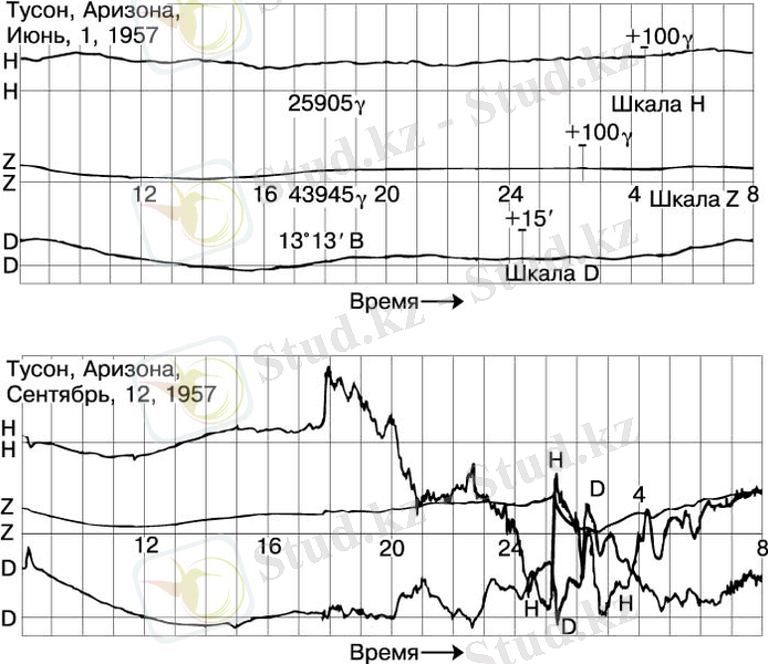 (Алдарыңыздағы график 1957 жылғы Аризона шт. Тусон геомагниттік обсерваториясында жасалған. Бұл график Н, D, Z құраушыларының амплитудасының ауытқуы негізінде есептелінген. Мұндағы 1-ші график тыныш күнде, ал екінші график магниттік дауыл болған күні жасалынған) .