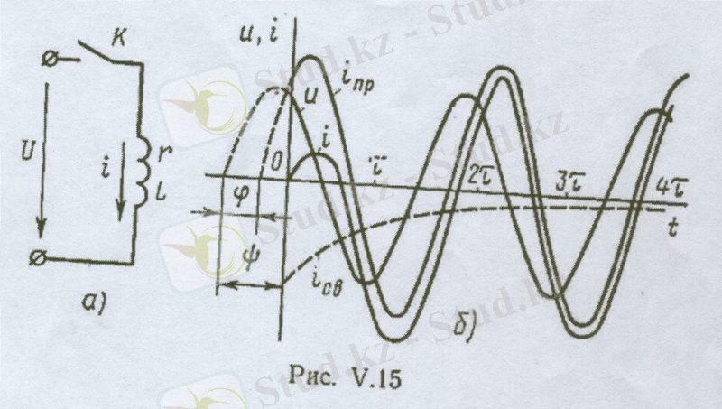 V. 15. -cуретте керсетілгендей, индуктивті катушканы қоссақ. Синусоидалы кернеудің көзіне, онда өтпелі процесс ерікті және қажетті режимдерден турады деп айтуға болады, яғни