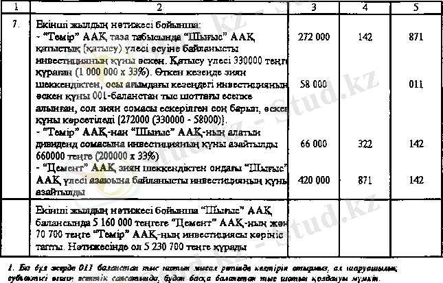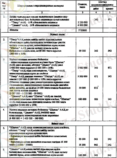 Мысал. "Шығыс" ААҚ қоғамы "Темір" ААҚ-ның 33% және "Цемент" ААҚ-ның 28 % акциясын сатып алған, сол сатып алынған акцияға сәйкес олардың құны: 3110 мың теңге және 4600 мың теңге құраған.