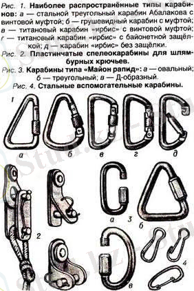 Карабин түрлері. Жасалуына қарай карабиндер құрыштан жасалынған (мықты, сенімді, бірақ ауыр), алюминдік (жеңіл және арзан, бірақ ауыр жүкке есептелмеген) және пластикалық (тек қана қосымша) болып табылады. Құлып типіне қарай: муфталанған және муфталанбаған, рапидтер. Муфта карабинге өзінен өзі ашылып кетуге жол бермейді. Рапидтер ауыр жүктерге арналған карабиндер үшін жасалған.