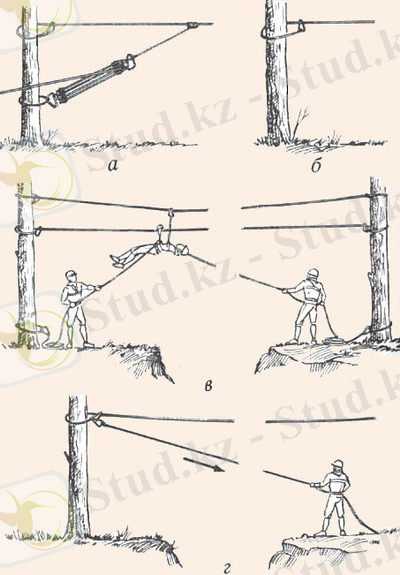 3. Бірінші қатысушының (№2) өтуінің схемасы. Екі карабин арқылы өту. Күрке карабиніне тасымалдаушы баудың карабині қосылады. Тасымалдаушы баудың екінші ұшы карабинмен ағашқа қосылған. Тасымалдаушы бау қатысушы қолынан босатылады (3-б суретті қара) . Өткеннен және өткелден түскеннен кейін №1 қатысушы тасымалдаушы баудың ұшын карабинмен ағашқа бекітеді. Тасымалдаушы баудың ортасына карабин құлыпталатын өткізуші байланады. Келесі қатысушылар мен жүктің өткелден өту кезінде тасымалдаушы бау екі жақтан жұмыс істейді (соңғысының өтуін қоспағанда) .