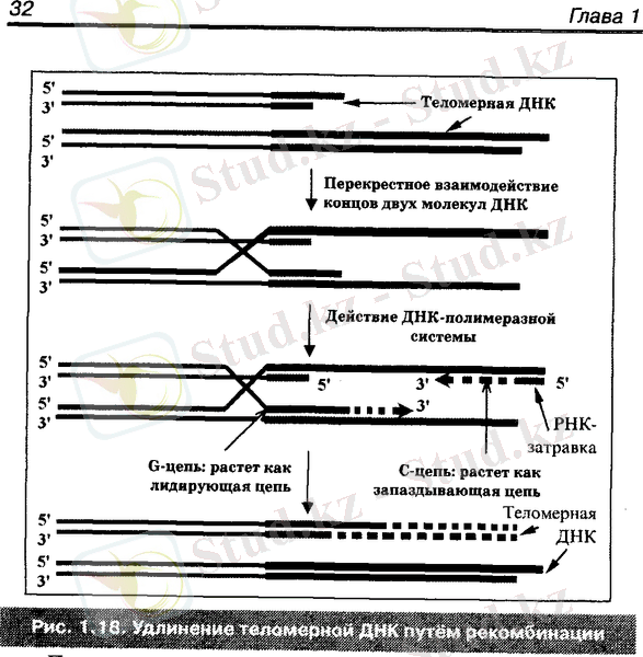 Сонда ұзынырақ тізбек матрица қызметін атқарып, сол бойынша ДНҚ - полимераза жүйесі қысқа тізбекті құрастырады. Екі гибридті теломердің бірі өсіп келе жатқан тізбектің лидері ( жай ұзару есесінен жүреді ), ал екінші теломерде артта қалушы ( Оказаки фрагменті түрінде қарама - қарсы ұшынан өседі) болады.