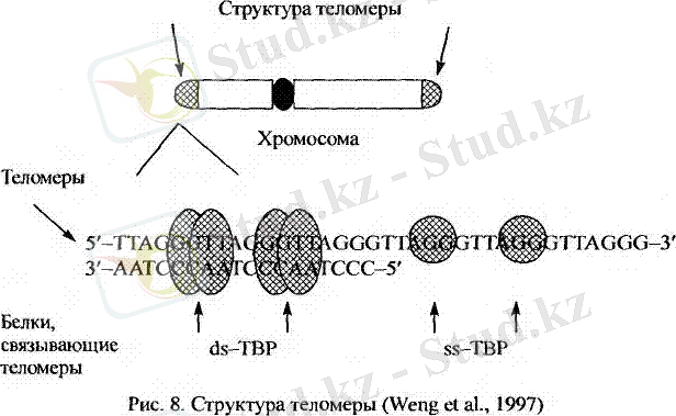Ғылыми деректер бойынша хромасома ұштарында генетикалық ақпарат болмайтын арнайы гексонуклеотид ( алты нуклеотидтен тұратын ) бірізділіктер қайталанып орналасады.