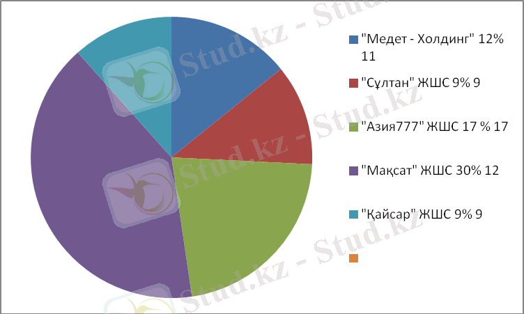 Серіктестіктің негізгі бәсекелестері «Медет - Холдинг» ЖШС, «Сұлтан» ЖШС, «Азия777» ЖШС, «Мақсат» ЖШСжәне «Қайсар» ЖШС болып табылады. Осындай арыстандай айбатты нарықтағы құрылыс ұйымдарынан қалыспай жұмыс атқаруда. Төмендегі суреттен компаниялардың Астана қаласы бойынша құрылыс нарығында қызмет көрсетуді өткізуден үлестік салмағын көресіздер.