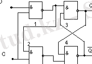 =0, егер Д=0. Д триггердің схемасында И-НЕ логикалық элементте 1, 2 элементтері кіріс логиканың схемасын құрады, ал 3, 4 -триггерлік ұяшықты. Тактілі импульстардың арасында 1, 2 элементтері жабық, олардың шығысында логикалық 1-лер бар, ол триггерлік ұяшыққа нейтралды комбинация болып табылады.