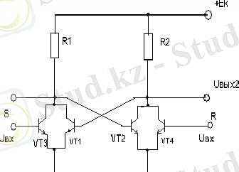 Негізгі триггер VT1, VT2 транзисторлары мен R1, R2 резисторларынан құрылған(микросхемаларда резистор динамикалық кедергі түрінде орындалады) . VT3, VT4 транзисторлары-көмекші кілттер, триггерлік ұяшықты басқару үшін қызмет ететін. Олар үнемі жабық болады да, триггерлік ұяшықтың сипаттамасына әсер етпейді. Триггерлердің екі тұрақты күйі бар: 1) VT1 транзисторы ашық және қаныққан, ал VT2 жабық; керісінше-VT2 ашық, VT1 жабық.